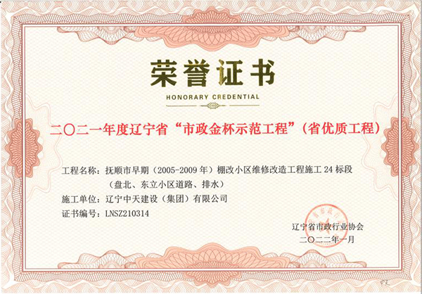 企業先后榮獲“全國優秀施工企業”、 “中國AAA級信用企業”、“全國保障性安居工程建設勞動競賽先進單位”、“遼寧省最受尊敬企業”、“遼寧省優秀建筑業企業”、“遼寧省工程建設質量管理優秀企業”、 “遼寧省守合同、重信用企業”、遼寧省“AAA級信用企業”、 “撫順市安全生產先進單位、紅旗單位”、“撫順市安康杯競賽先進集體”等多項殊榮。